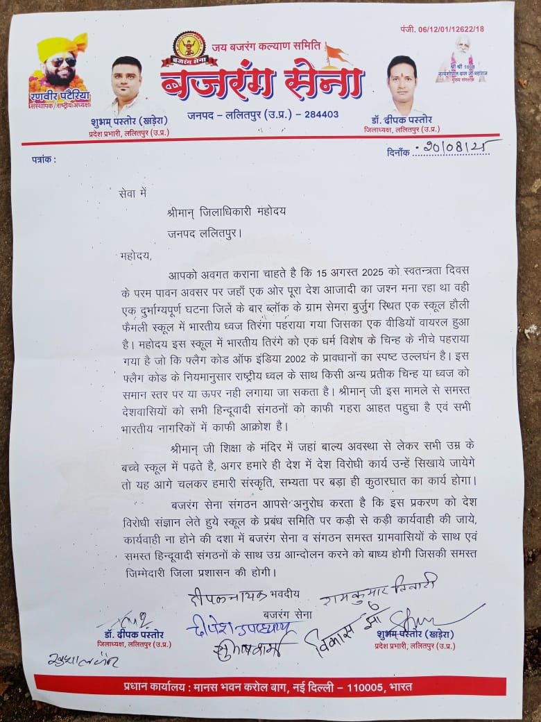 बजरंग सेना संगठन ने आज जिलाध्यक्ष डॉक्टर दीपक पस्तोर के नेतृत्व में जिलाधिकारी महोदय को ज्ञापन सौंपा जिसमें अवगत कराया गया कि 15 अगस्त को स्वतंत्रता दिवस के परम पावन अवसर पर बार ब्लॉक के ग्राम सेमरा बुजुर्ग के होली फैमिली स्कूल में ध्वज रोहण के समय स्कूल प्रबंधन द्वारा तिरंगे का घोर अपमान किया गया जिसका वीडियो ओर फोटो सोशल मीडिया पर वायरल हुआ है वायरल वीडियो में एक धर्म विशेष के चिन्ह के नीचे तिरंगे झंडे को फहराया गया है और हमारे राष्टीय ध्वज तिरंगे की फहराने के स्थिति बड़ी ही आपत्तिजनक है महोदय फ्लैग कोड ऑफ इंडिया 2002 के प्रावधानों के अनुसार किसी भी धर्म विशेष के चिन्ह या प्रतीक को राष्टीय ध्वज के समान या ऊपर नीचे कही भी नहीं लगाया जा सकता है यह हमारे भारतीय फ्लैग कोड के नियम के विरुद्ध है